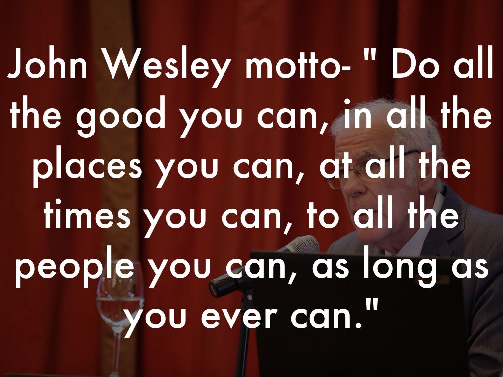 John Wesley motto- " Do all the good you can, in all the places you can, at all the times you can, to all the people you can, as long as you ever can."