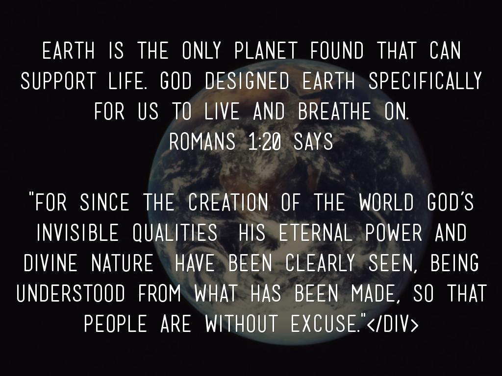 earth is the only planet found that can support life. God designed earth specifically for us to live and breathe on. Romans 1:20 says