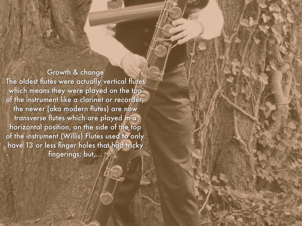 Growth & change The oldest flutes were actually vertical flutes which means they were played on the top of the instrument like a clarinet or recorder; the newer (aka modern flutes) are now transverse flutes which are played in a horizontal position, on the side of the top of the instrument.(Willis) Flutes used to only have 13 or less finger holes that had tricky fingerings; but,