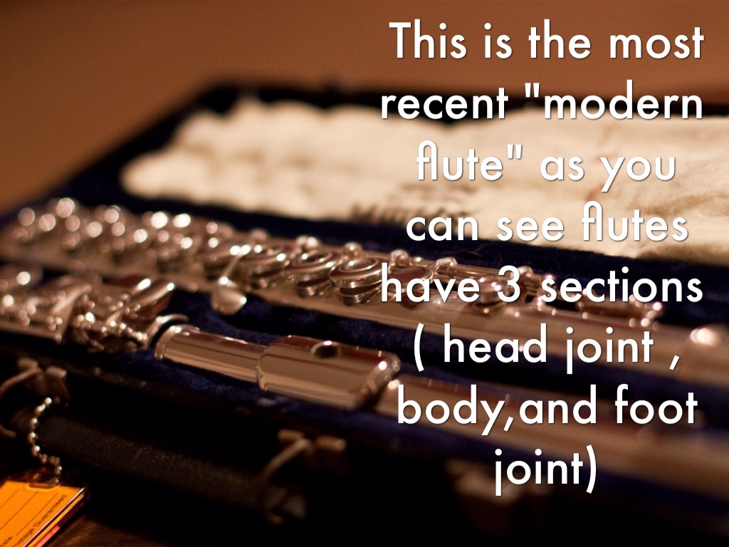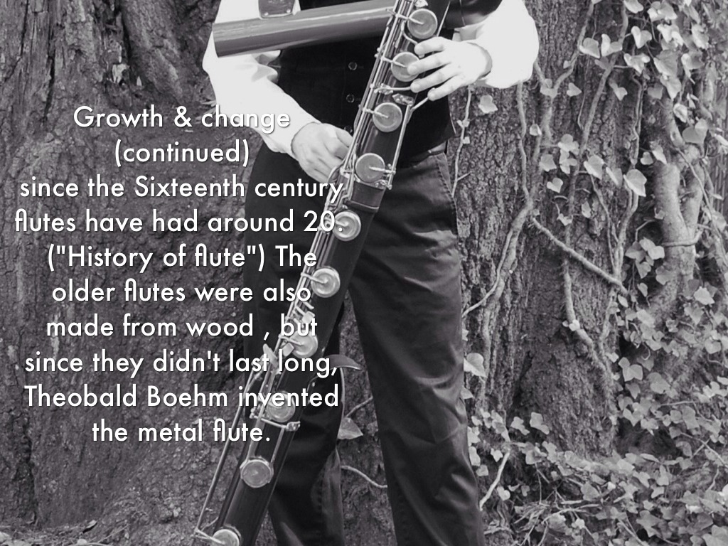 Growth & change (continued) since the Sixteenth century flutes have had around 20. ("History of flute") The older flutes were also made from wood , but since they didn't last long, Theobald Boehm invented the metal flute.