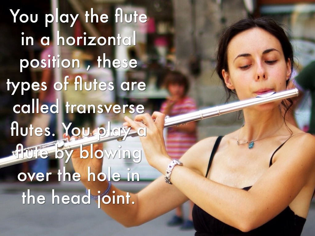 You play the flute in a horizontal position , these types of flutes are called transverse flutes. You play a flute by blowing over the hole in the head joint.