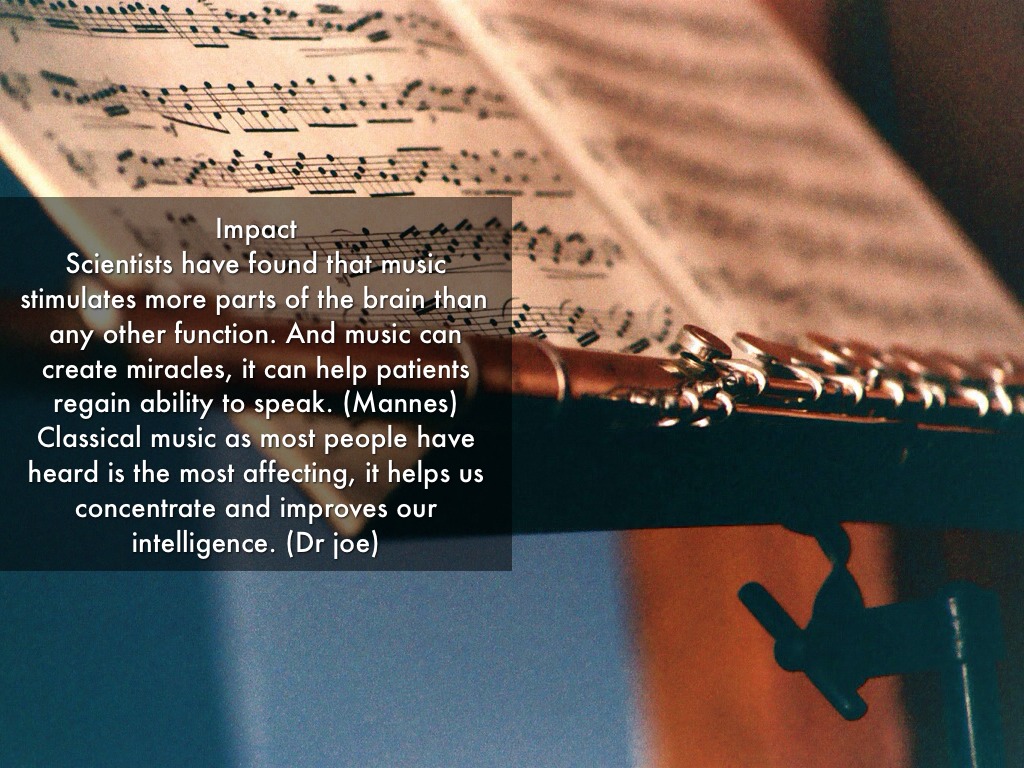 Impact Scientists have found that music stimulates more parts of the brain than any other function. And music can create miracles, it can help patients regain ability to speak. (Mannes) Classical music as most people have heard is the most affecting, it helps us concentrate and improves our intelligence. (Dr joe)