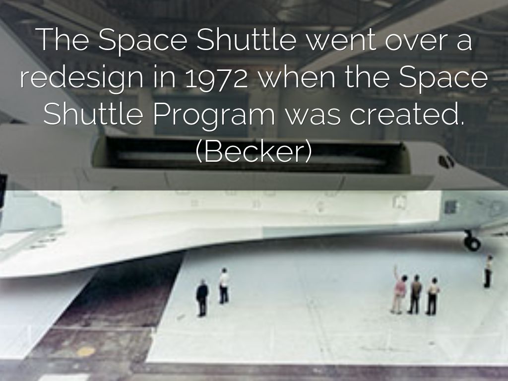 The Space Shuttle went over a redesign in 1972 when the Space Shuttle Program was created.(Becker)
