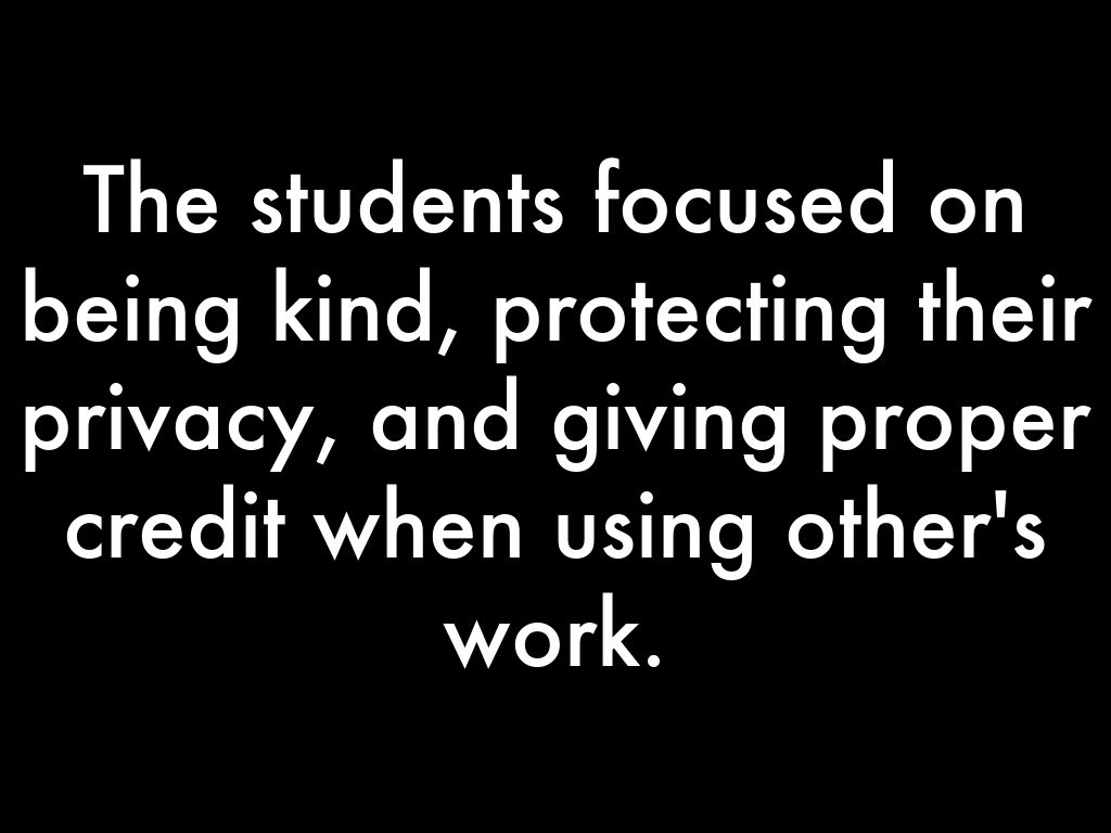 The students focused on being kind, protecting their privacy, and giving proper credit when using other's work.