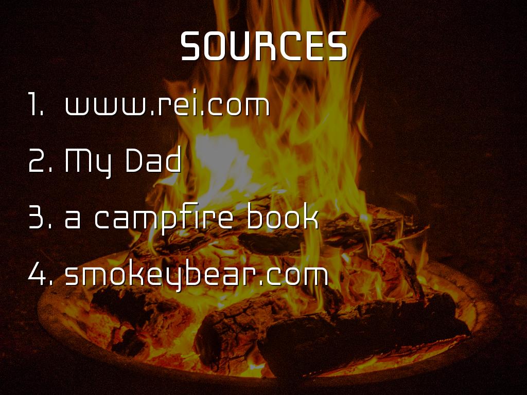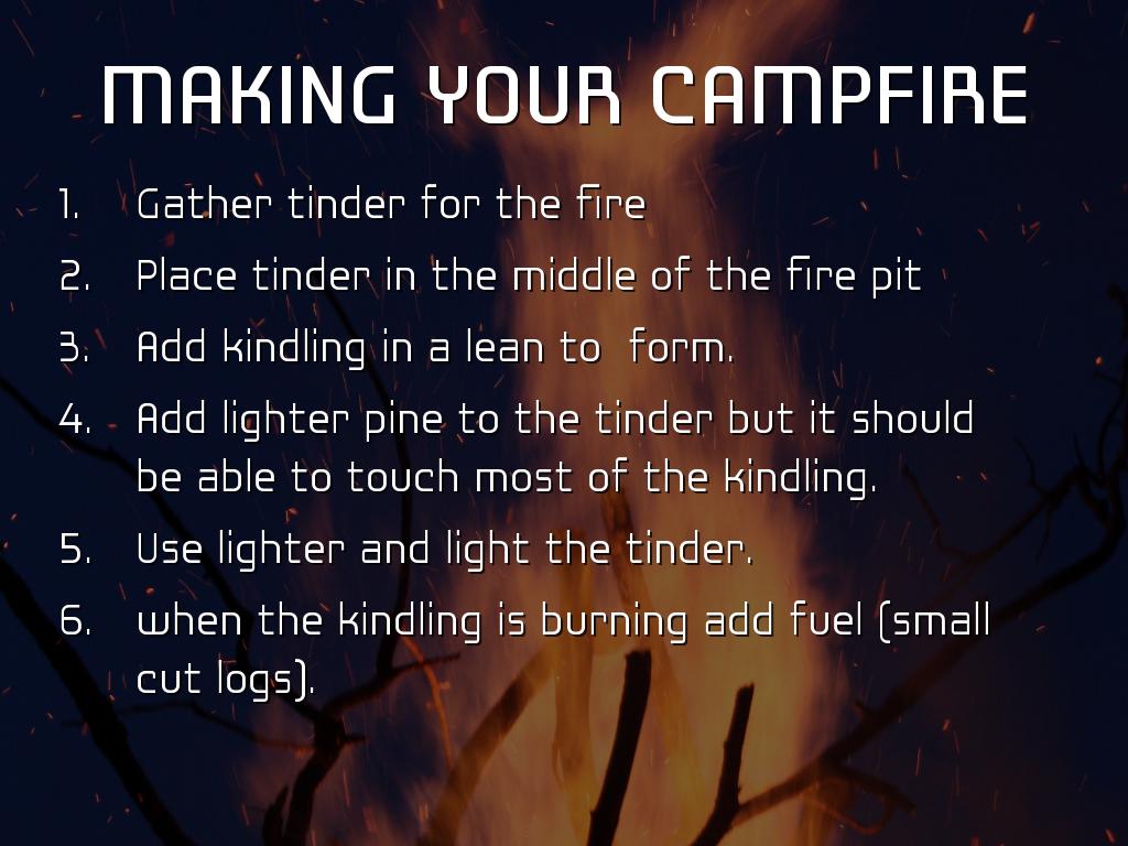 • You need 3 types of wood: Tinder (pine needles leaves), Kindling (small sticks) and Fuel (large cut logs)