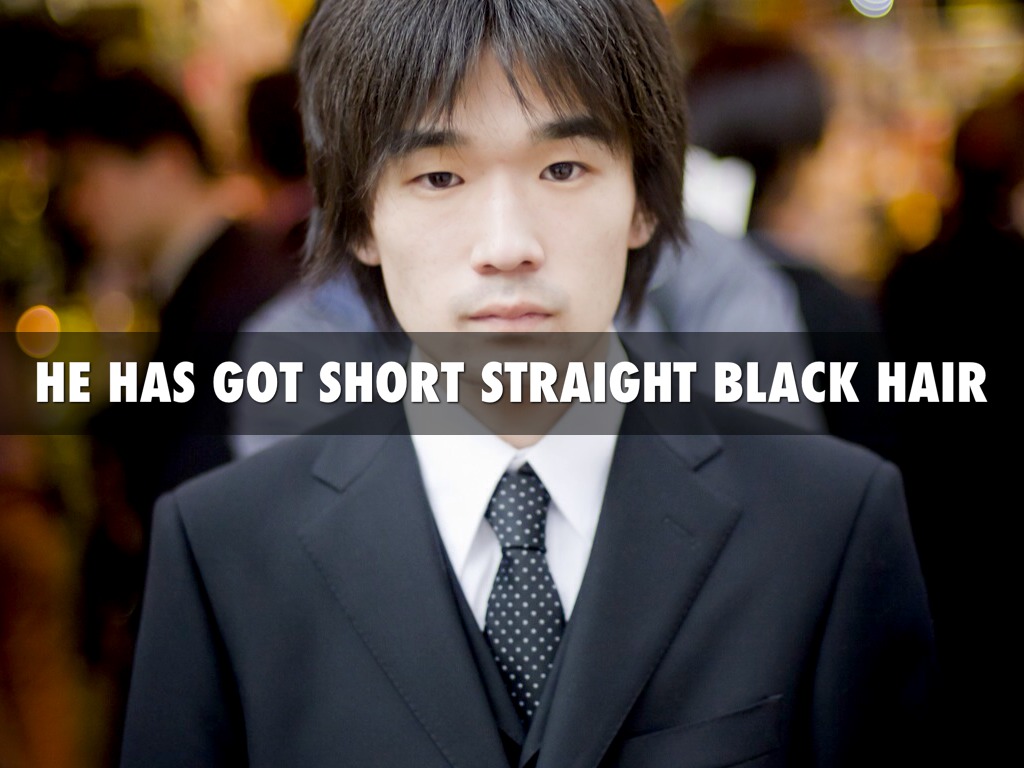 HE HAS GOT SHORT STRAIGHT BLACK HAIR