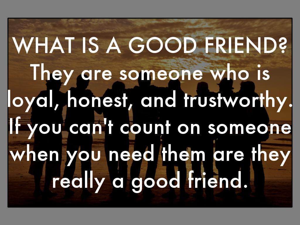 WHAT IS A GOOD FRIEND? They are someone who is loyal, honest, and trustworthy. If you can't count on someone when you need them are they really a good friend.