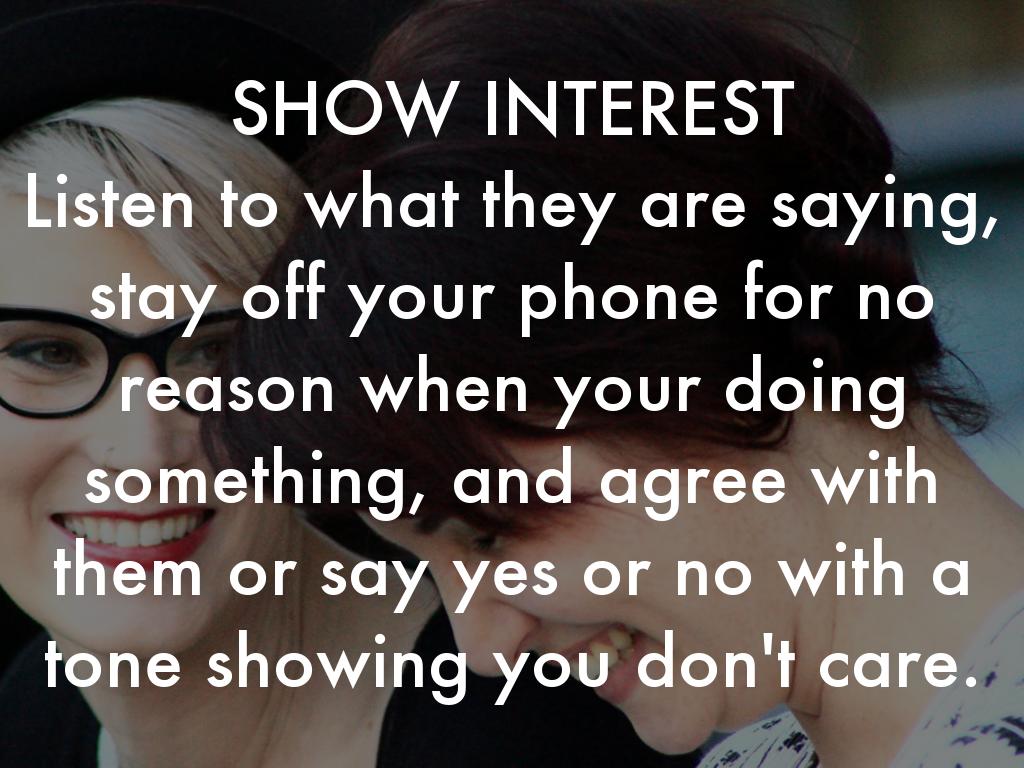 SHOW INTEREST Listen to what they are saying, stay off your phone for no reason when your doing something, and agree with them or say yes or no with a tone showing you don't care.
