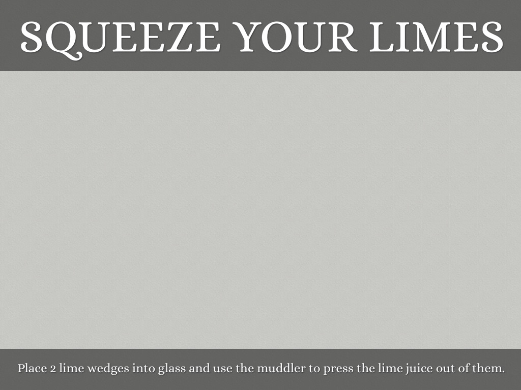 Place 2 lime wedges into glass and use the muddler to press the lime juice out of them.