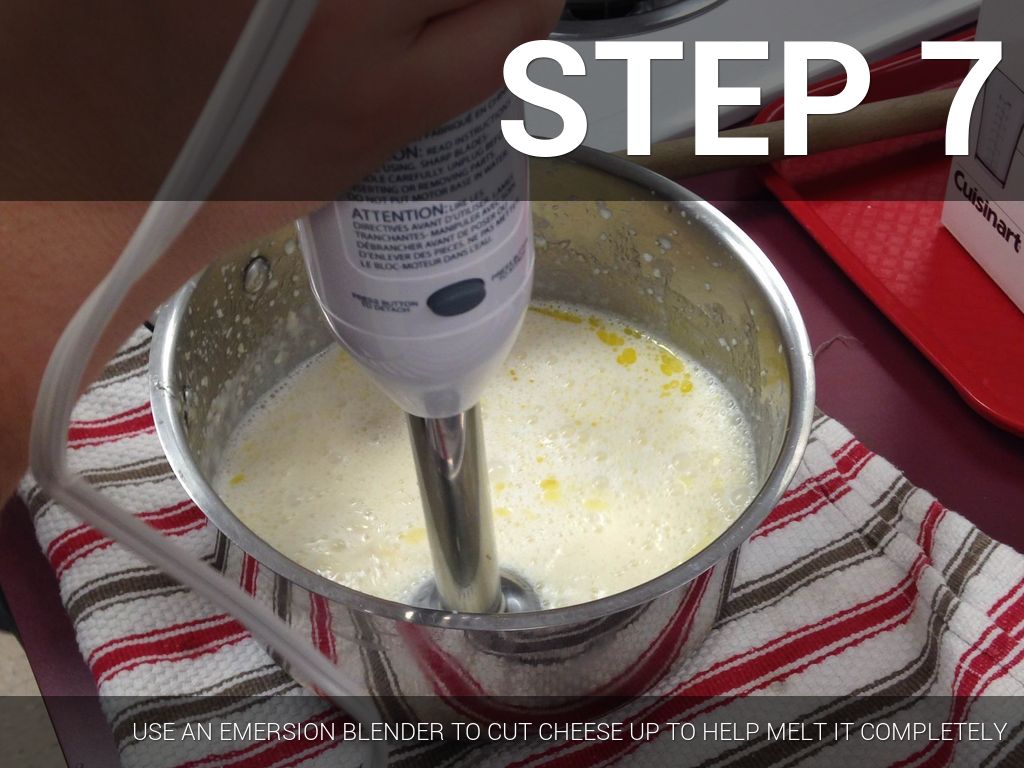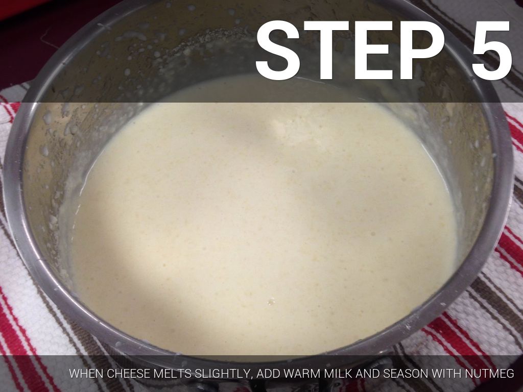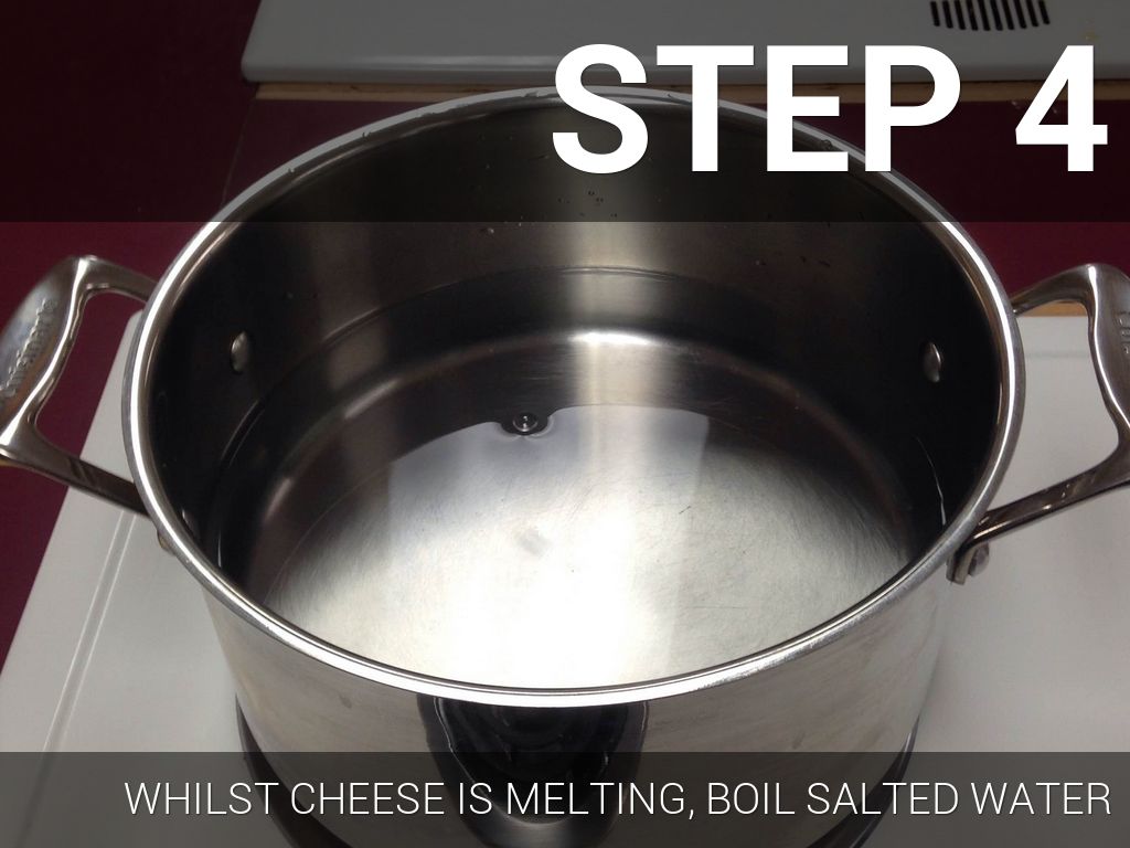 REMOVE SAUCEPAN FROM HEAT AND ADD FOUR CHEESES INTO SAUCEPAN