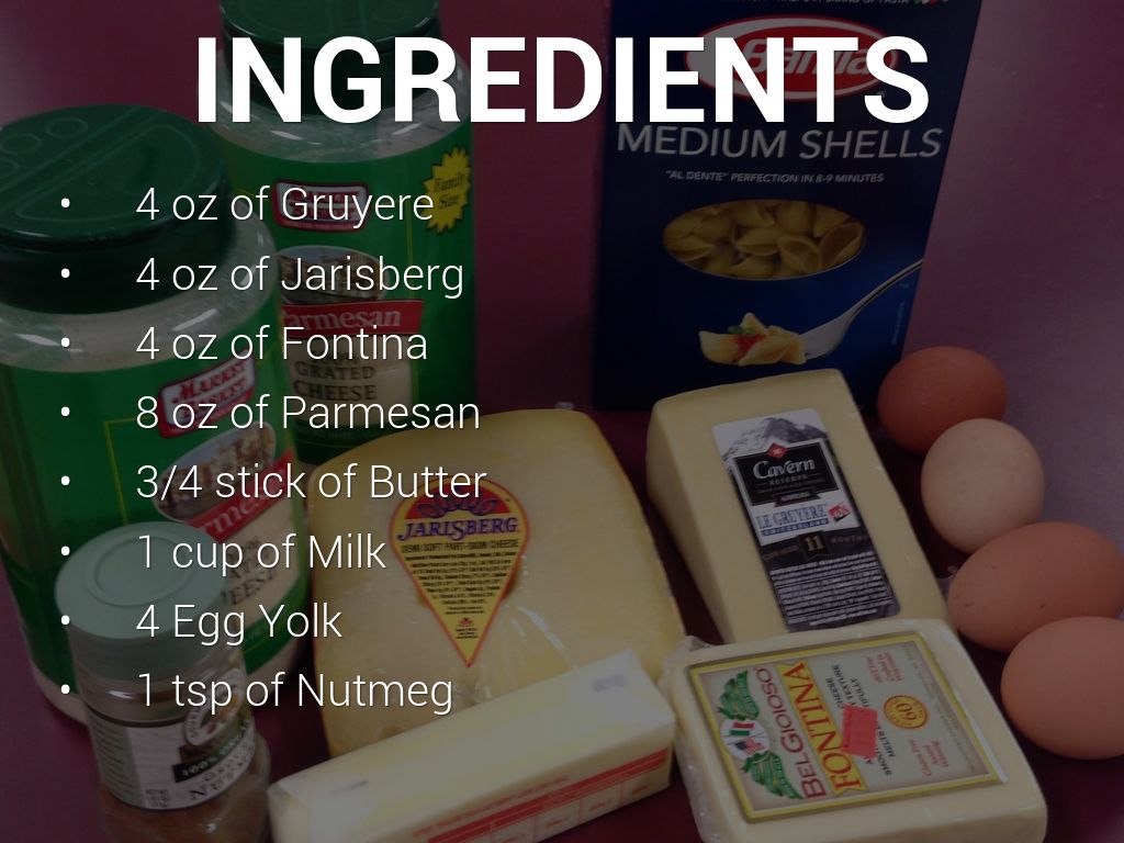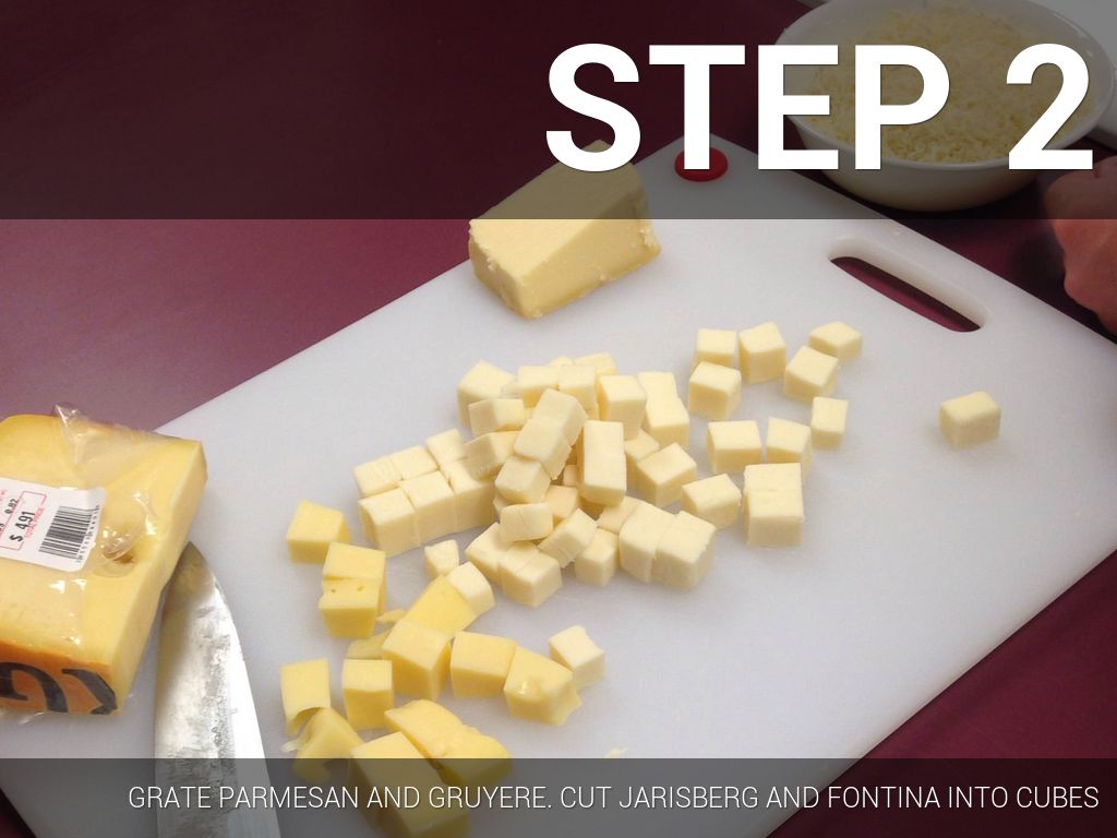 Grate parmesan and Gruyere. Cut Jarisberg and Fontina into cubes