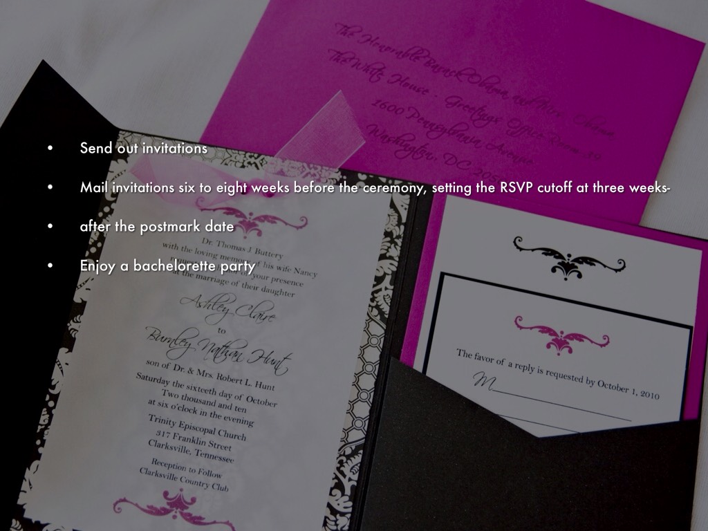 • Mail invitations six to eight weeks before the ceremony, setting the RSVP cutoff at three weeks-