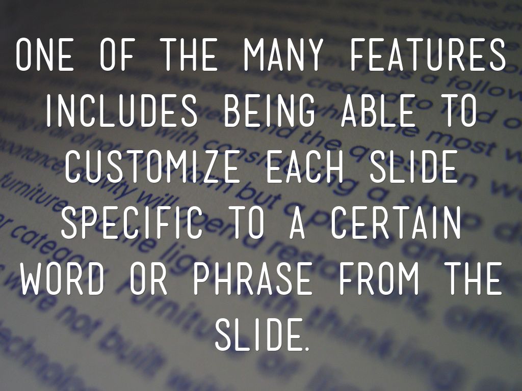 One of the many features includes being able to customize each slide specific to a certain word or phrase from the slide.