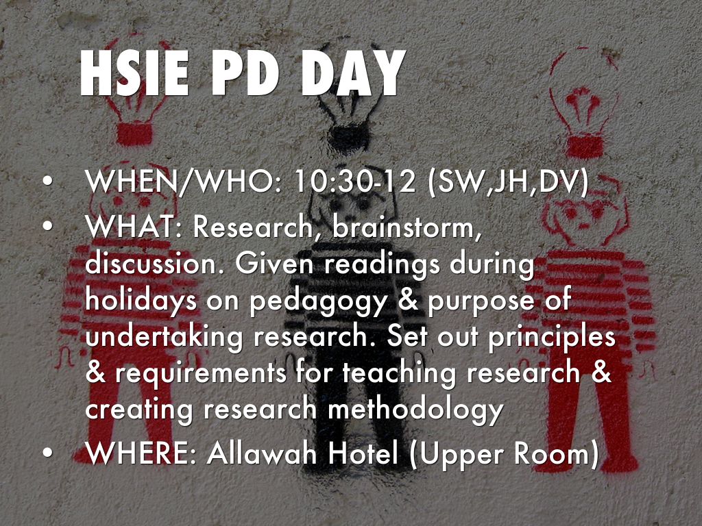 WHAT: Research, brainstorm, discussion. Given readings during holidays on pedagogy & purpose of undertaking research. Set out principles & requirements for teaching research & creating research methodology