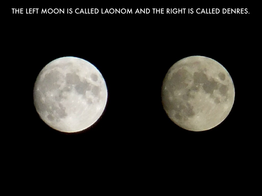THE LEFT MOON IS CALLED LAONOM AND THE RIGHT IS CALLED DENRES.