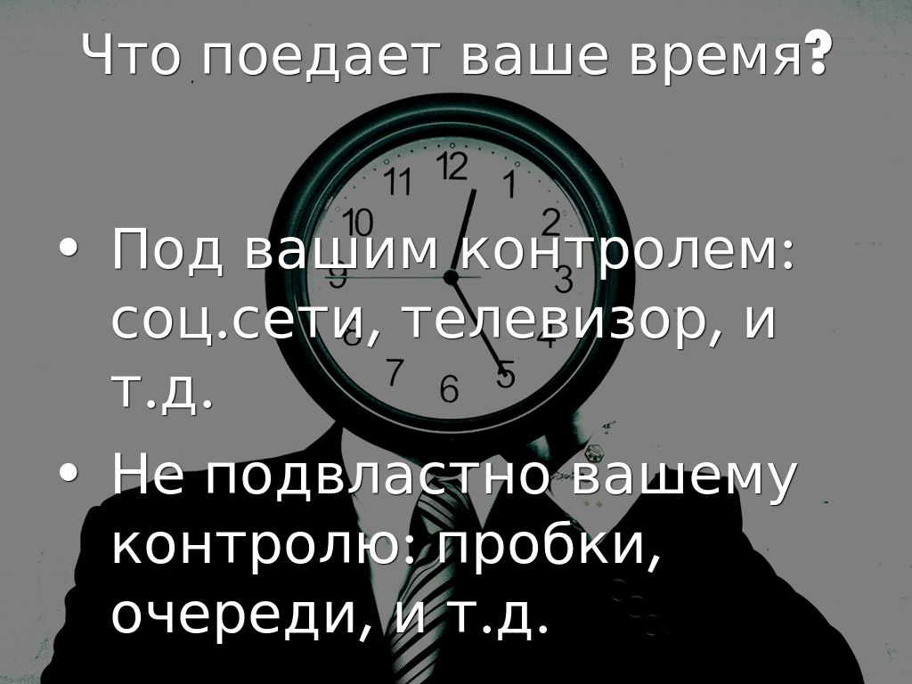 Не подвластно вашему контролю: пробки, очереди, и т.д.