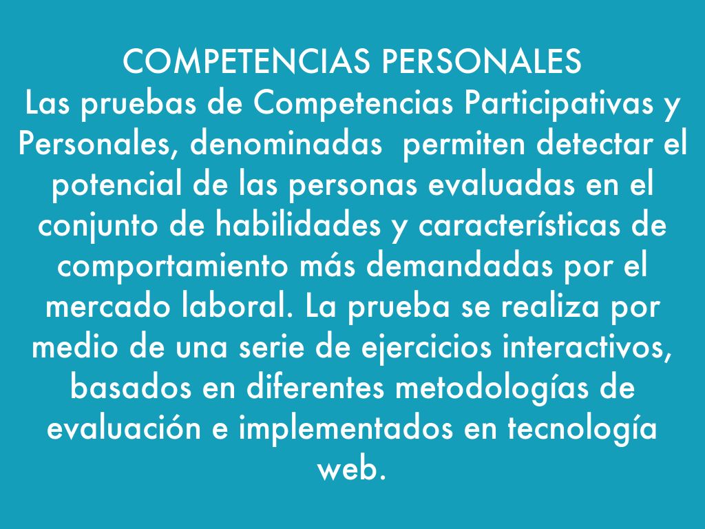 Las pruebas de Competencias Participativas y Personales, denominadas permiten detectar el potencial de las personas evaluadas en el conjunto de habilidades y características de comportamiento más demandadas por el mercado laboral. La prueba se realiza por medio de una serie de ejercicios interactivos, basados en diferentes metodologías de evaluación e implementados en tecnología web.