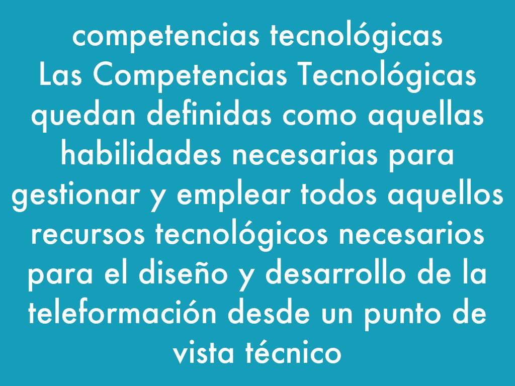 Las Competencias Tecnológicas quedan definidas como aquellas habilidades necesarias para gestionar y emplear todos aquellos recursos tecnológicos necesarios para el diseño y desarrollo de la teleformación desde un punto de vista técnico