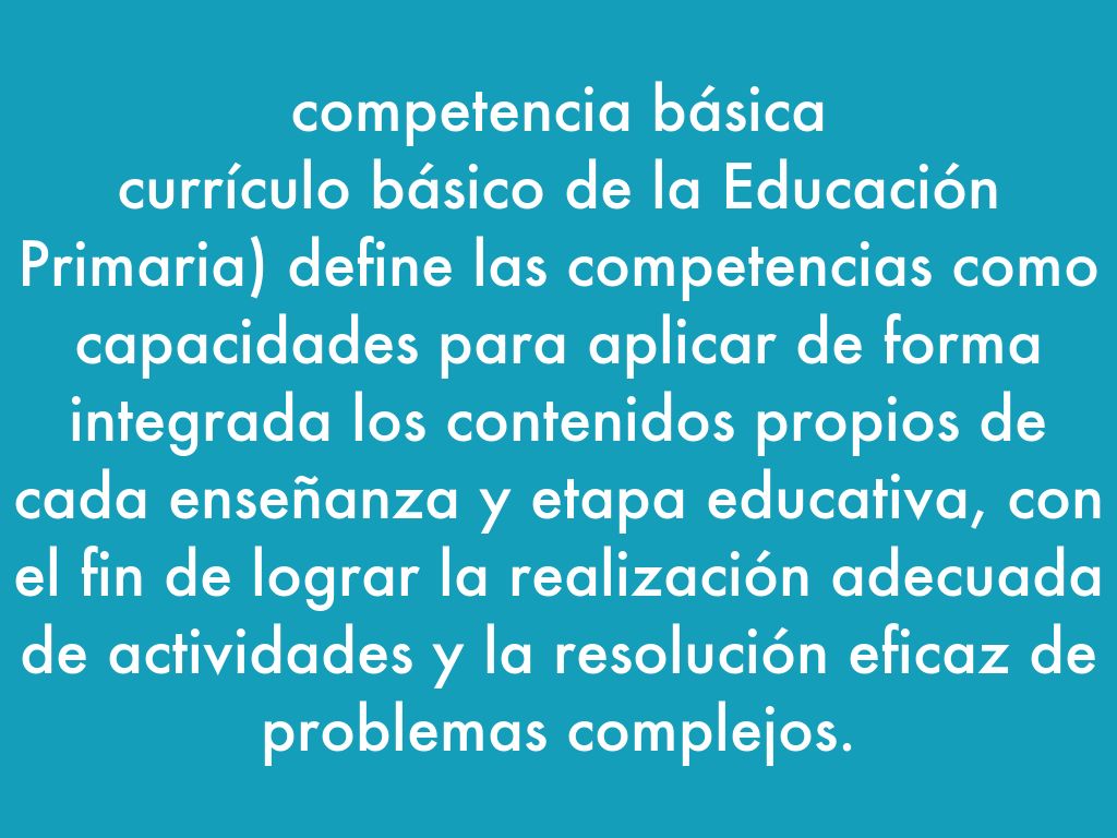 currículo básico de la Educación Primaria) define las competencias como capacidades para aplicar de forma integrada los contenidos propios de cada enseñanza y etapa educativa, con el fin de lograr la realización adecuada de actividades y la resolución eficaz de problemas complejos.