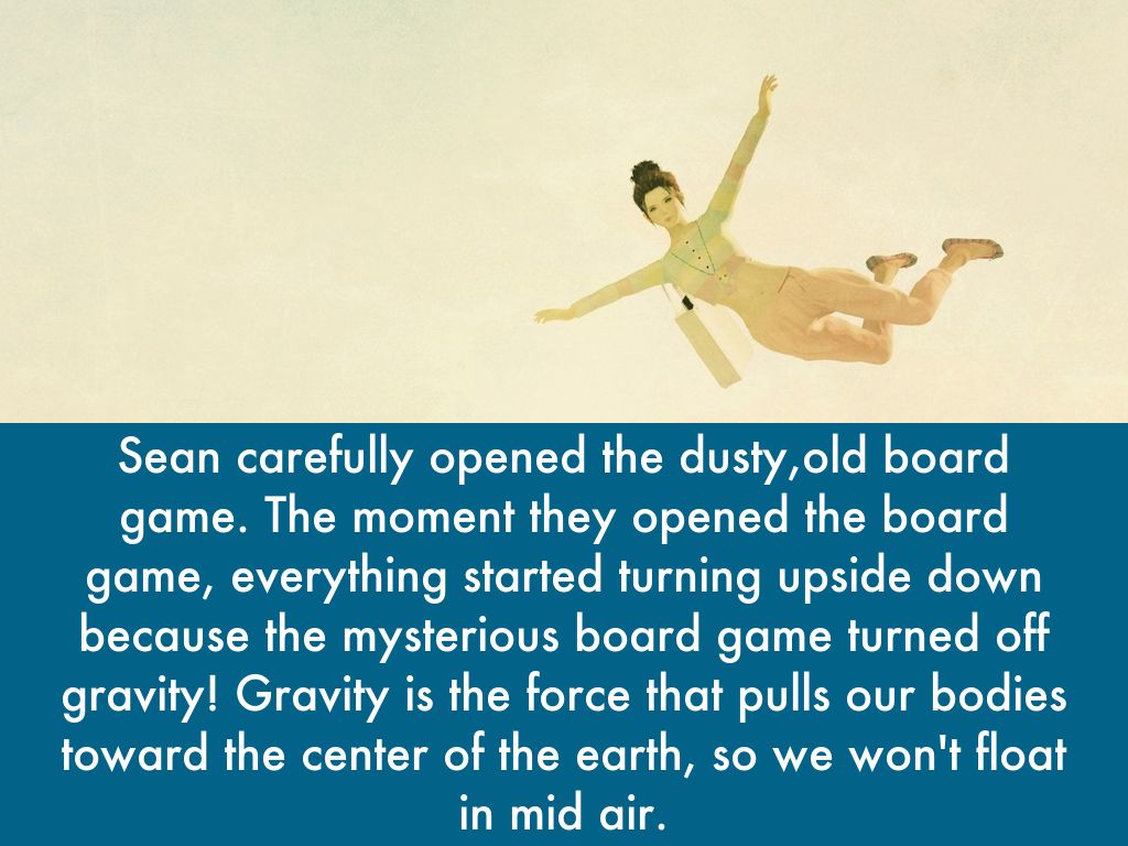 Sean carefully opened the dusty,old board game. The moment they opened the board game, everything started turning upside down because the mysterious board game turned off gravity! Gravity is the force that pulls our bodies toward the center of the earth, so we won't float in mid air.