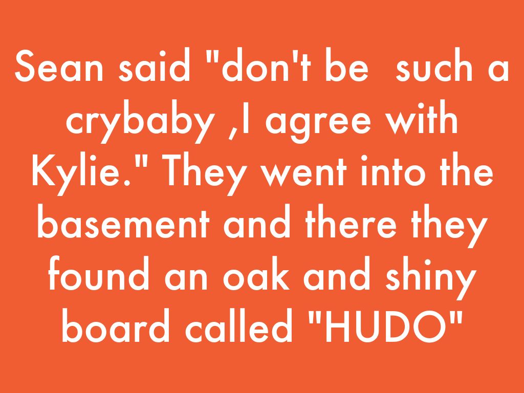 Sean said "don't be such a crybaby ,I agree with Kylie." They went into the basement and there they found an oak and shiny board called "HUDO"