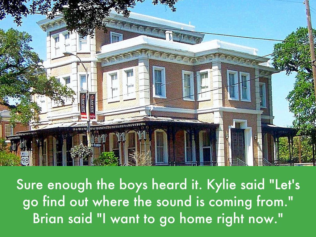 Sure enough the boys heard it. Kylie said "Let's go find out where the sound is coming from." Brian said "I want to go home right now."