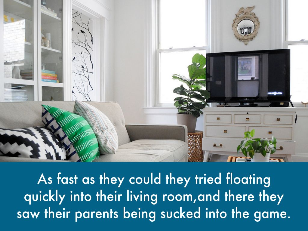 As fast as they could they tried floating quickly into their living room,and there they saw their parents being sucked into the game.
