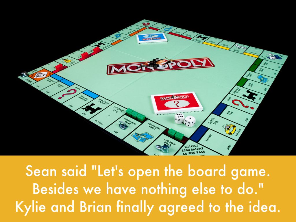 Sean said "Let's open the board game. Besides we have nothing else to do." Kylie and Brian finally agreed to the idea.