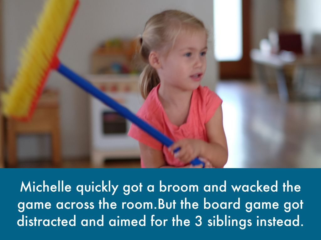Michelle quickly got a broom and wacked the game across the room.But the board game got distracted and aimed for the 3 siblings instead.