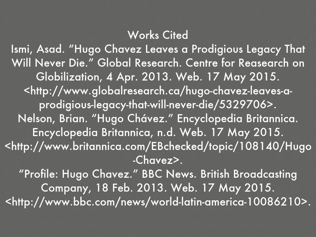 Ismi, Asad. “Hugo Chavez Leaves a Prodigious Legacy That Will Never Die.” Global Research. Centre for Reasearch on Globilization, 4 Apr. 2013. Web. 17 May 2015. .