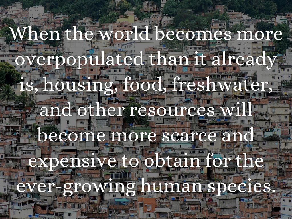 When the world becomes more overpopulated than it already is, housing, food, freshwater, and other resources will become more scarce and expensive to obtain for the ever-growing human species.