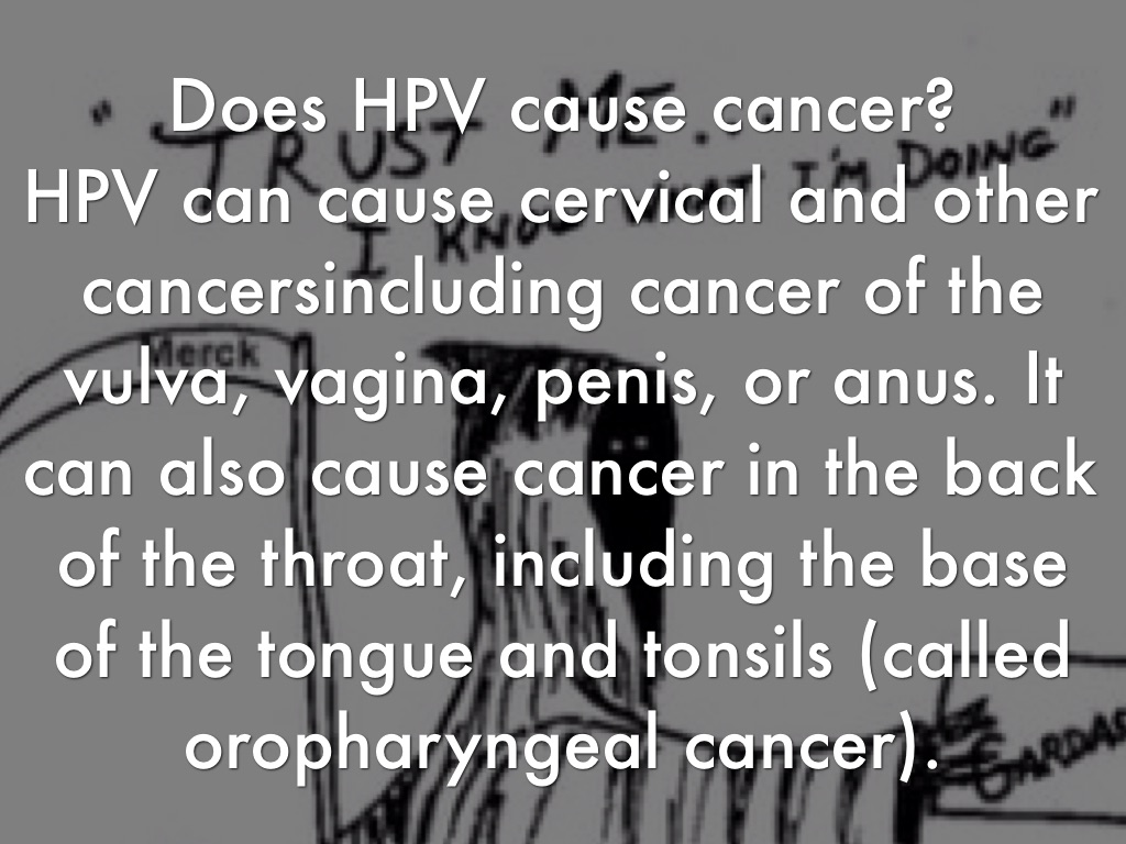 HPV can cause cervical and other cancersincluding cancer of the vulva, vagina, penis, or anus. It can also cause cancer in the back of the throat, including the base of the tongue and tonsils (called oropharyngeal cancer).
