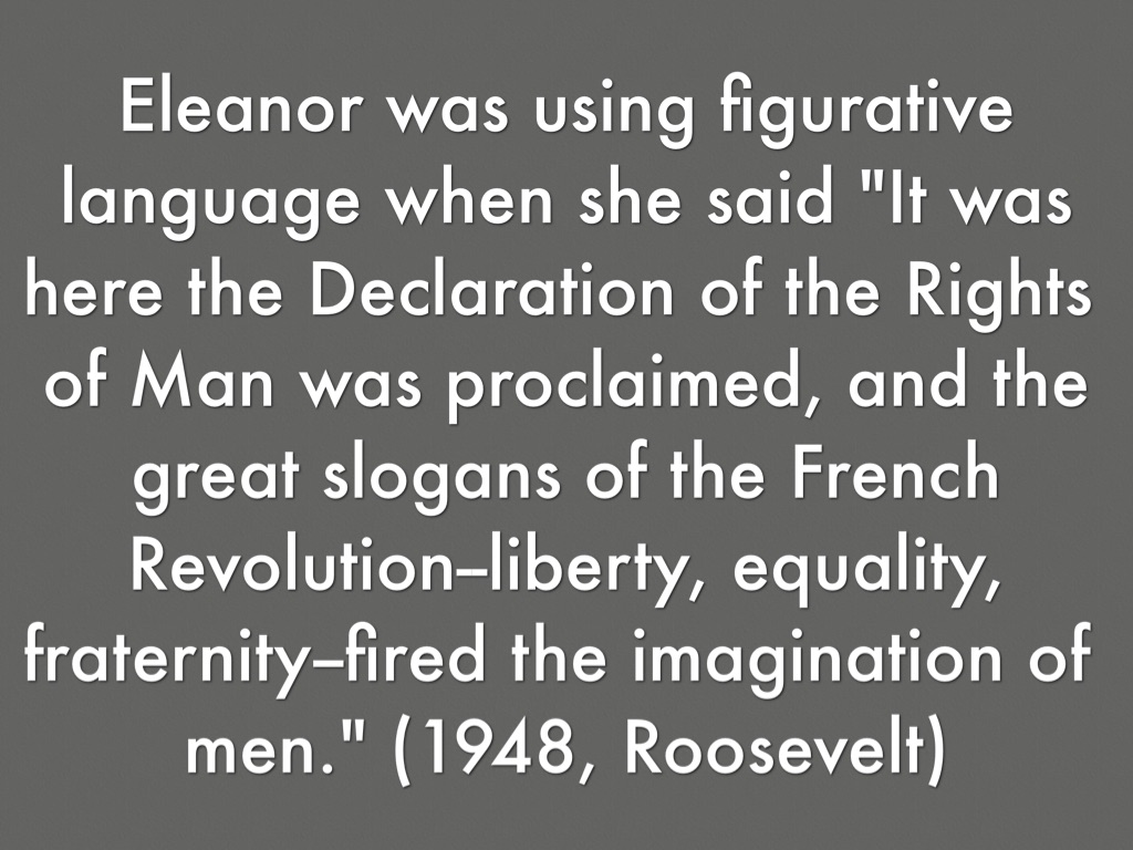 Eleanor was using figurative language when she said "It was here the Declaration of the Rights of Man was proclaimed, and the great slogans of the French Revolution--liberty, equality, fraternity--fired the imagination of men." (1948, Roosevelt)