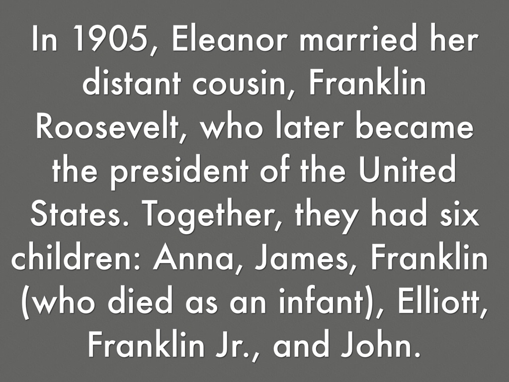 In 1905, Eleanor married her distant cousin, Franklin Roosevelt, who later became the president of the United States. Together, they had six children: Anna, James, Franklin (who died as an infant), Elliott, Franklin Jr., and John.