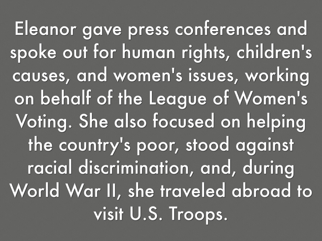 Eleanor gave press conferences and spoke out for human rights, children's causes, and women's issues, working on behalf of the League of Women's Voting. She also focused on helping the country's poor, stood against racial discrimination, and, during World War II, she traveled abroad to visit U.S. Troops.