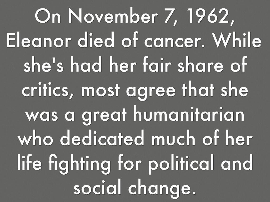 On November 7, 1962, Eleanor died of cancer. While she's had her fair share of critics, most agree that she was a great humanitarian who dedicated much of her life fighting for political and social change.
