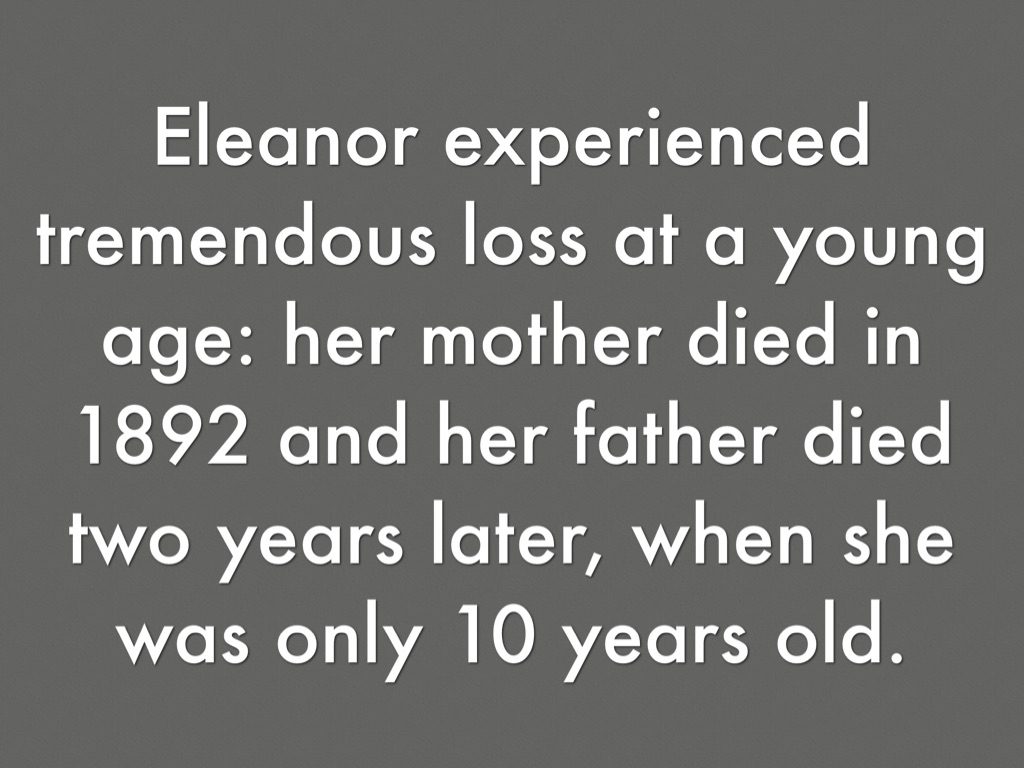 Eleanor experienced tremendous loss at a young age: her mother died in 1892 and her father died two years later, when she was only 10 years old.