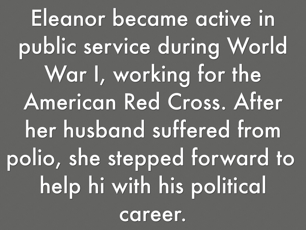 Eleanor became active in public service during World War I, working for the American Red Cross. After her husband suffered from polio, she stepped forward to help hi with his political career.