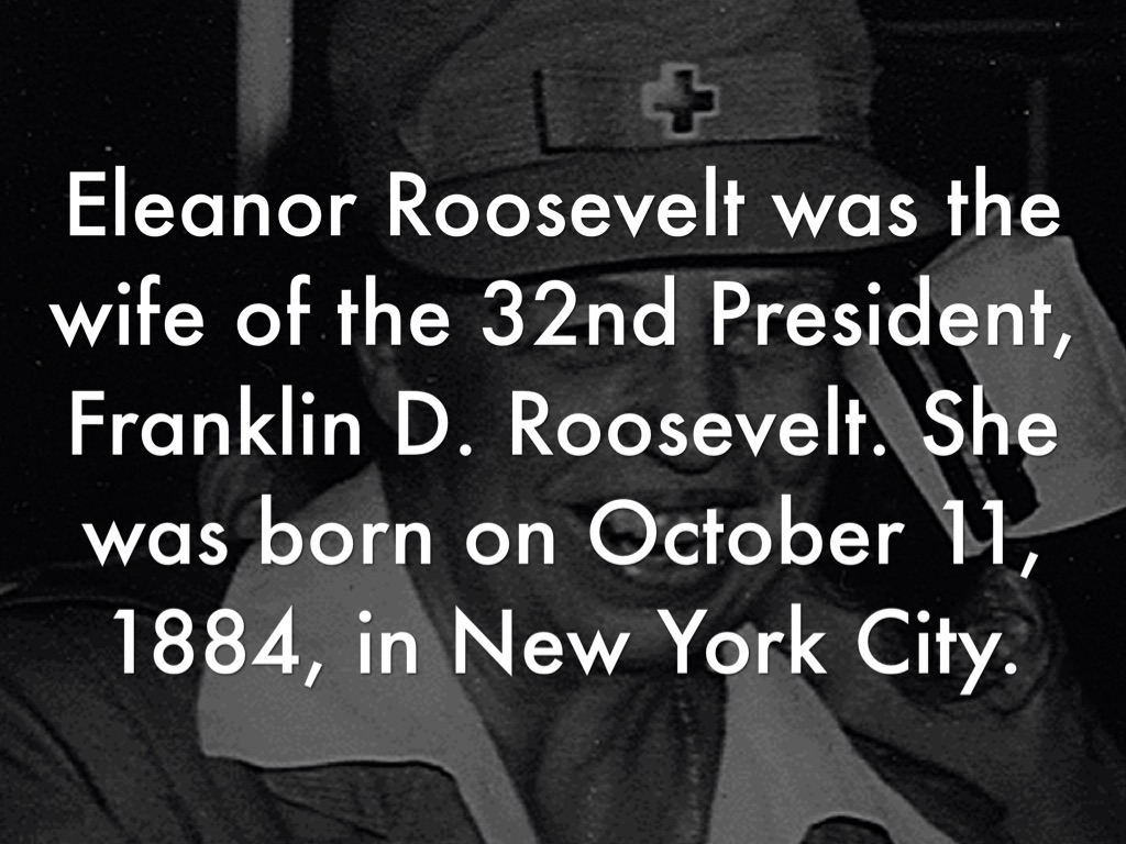 Eleanor Roosevelt was the wife of the 32nd President, Franklin D. Roosevelt. She was born on October 11, 1884, in New York City.