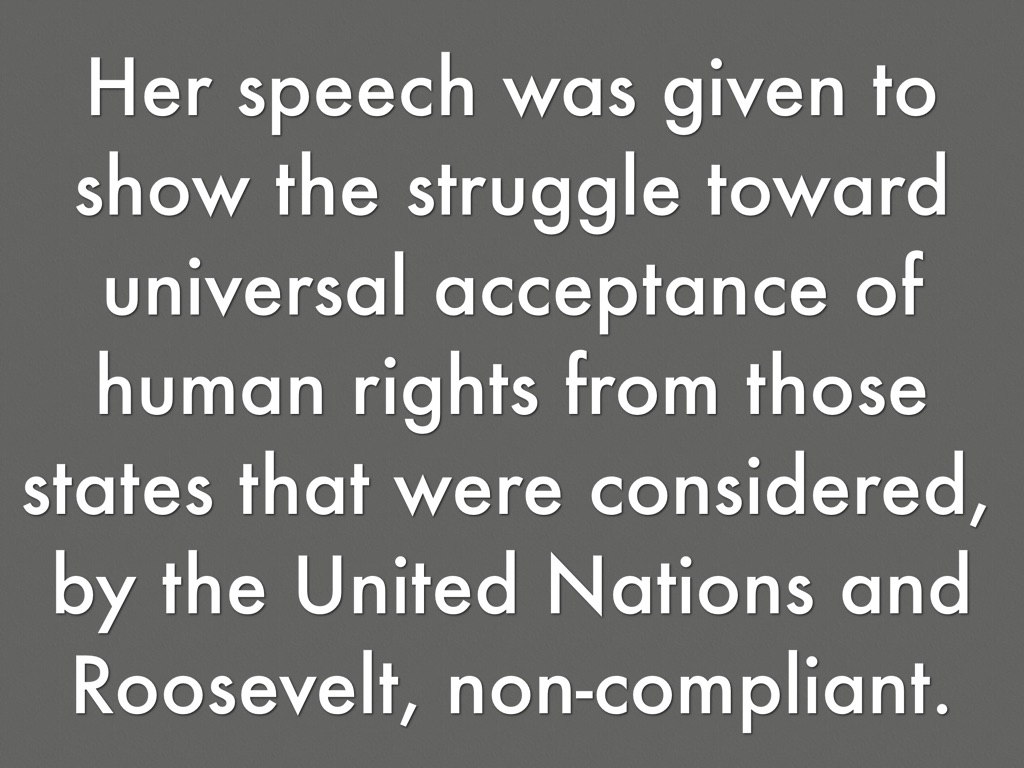 Her speech was given to show the struggle toward universal acceptance of human rights from those states that were considered, by the United Nations and Roosevelt, non-compliant.