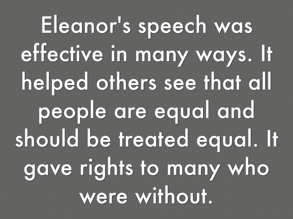 Eleanor's speech was effective in many ways. It helped others see that all people are equal and should be treated equal. It gave rights to many who were without.