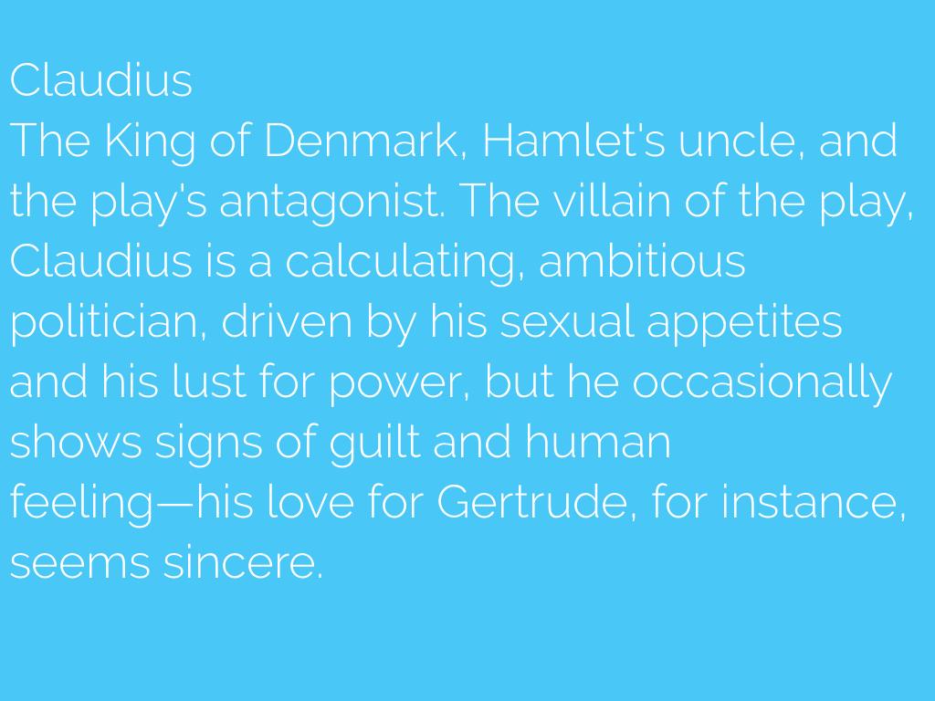 The King of Denmark, Hamlet's uncle, and the play's antagonist. The villain of the play, Claudius is a calculating, ambitious politician, driven by his sexual appetites and his lust for power, but he occasionally shows signs of guilt and human feeling—his love for Gertrude, for instance, seems sincere.