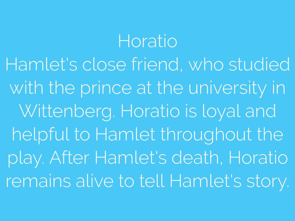Hamlet's close friend, who studied with the prince at the university in Wittenberg. Horatio is loyal and helpful to Hamlet throughout the play. After Hamlet's death, Horatio remains alive to tell Hamlet's story.