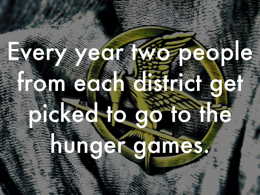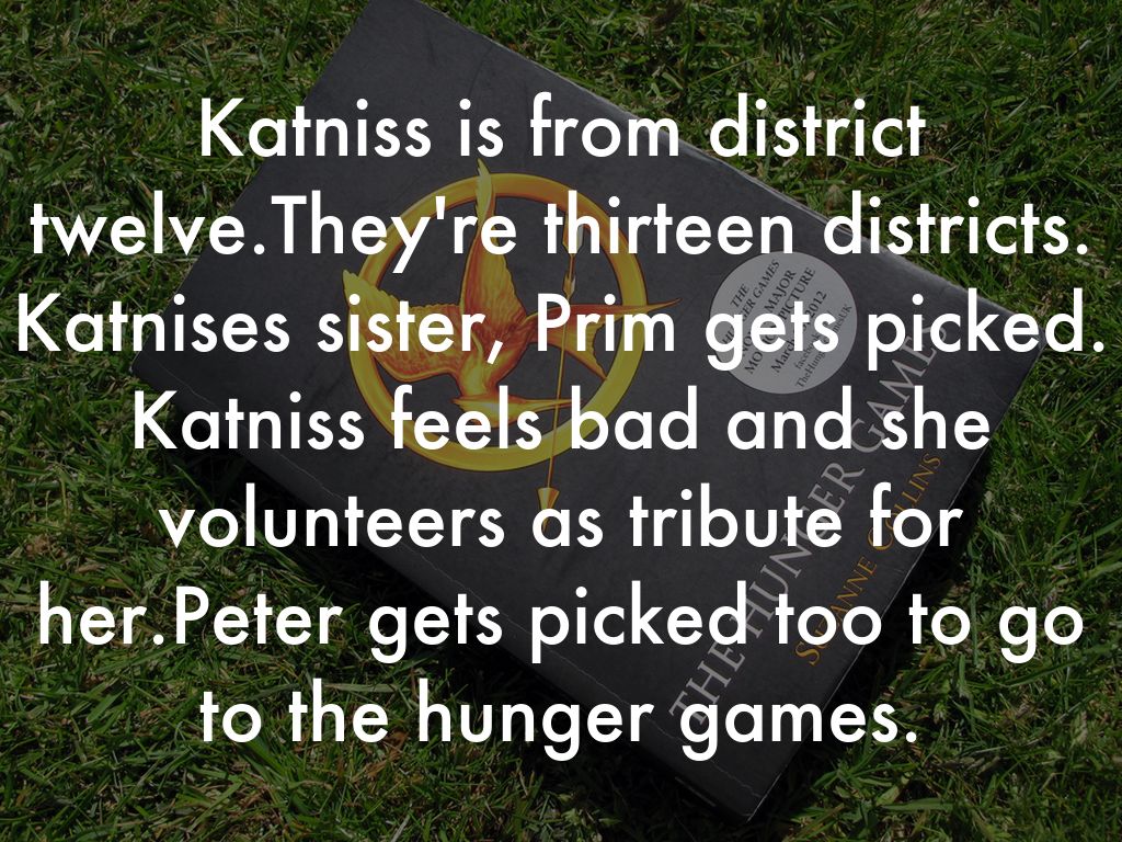 Katniss is from district twelve.They're thirteen districts. Katnises sister, Prim gets picked. Katniss feels bad and she volunteers as tribute for her.Peter gets picked too to go to the hunger games.