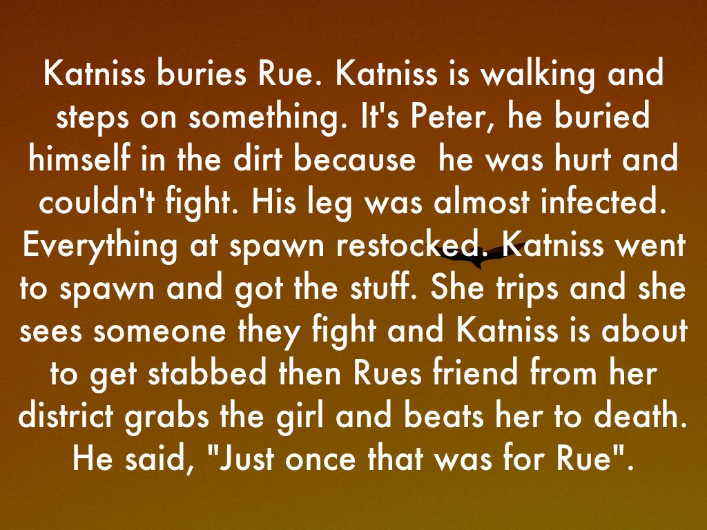 Katniss buries Rue. Katniss is walking and steps on something. It's Peter, he buried himself in the dirt because he was hurt and couldn't fight. His leg was almost infected. Everything at spawn restocked. Katniss went to spawn and got the stuff. She trips and she sees someone they fight and Katniss is about to get stabbed then Rues friend from her district grabs the girl and beats her to death. He said, "Just once that was for Rue".