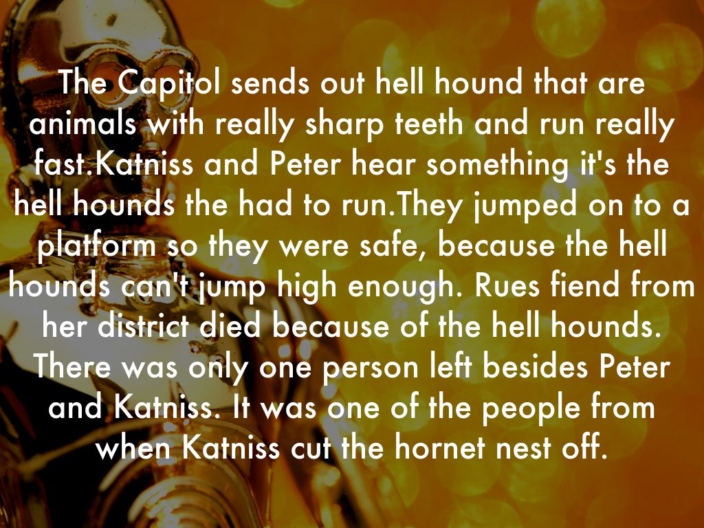 The Capitol sends out hell hound that are animals with really sharp teeth and run really fast.Katniss and Peter hear something it's the hell hounds the had to run.They jumped on to a platform so they were safe, because the hell hounds can't jump high enough. Rues fiend from her district died because of the hell hounds. There was only one person left besides Peter and Katniss. It was one of the people from when Katniss cut the hornet nest off.