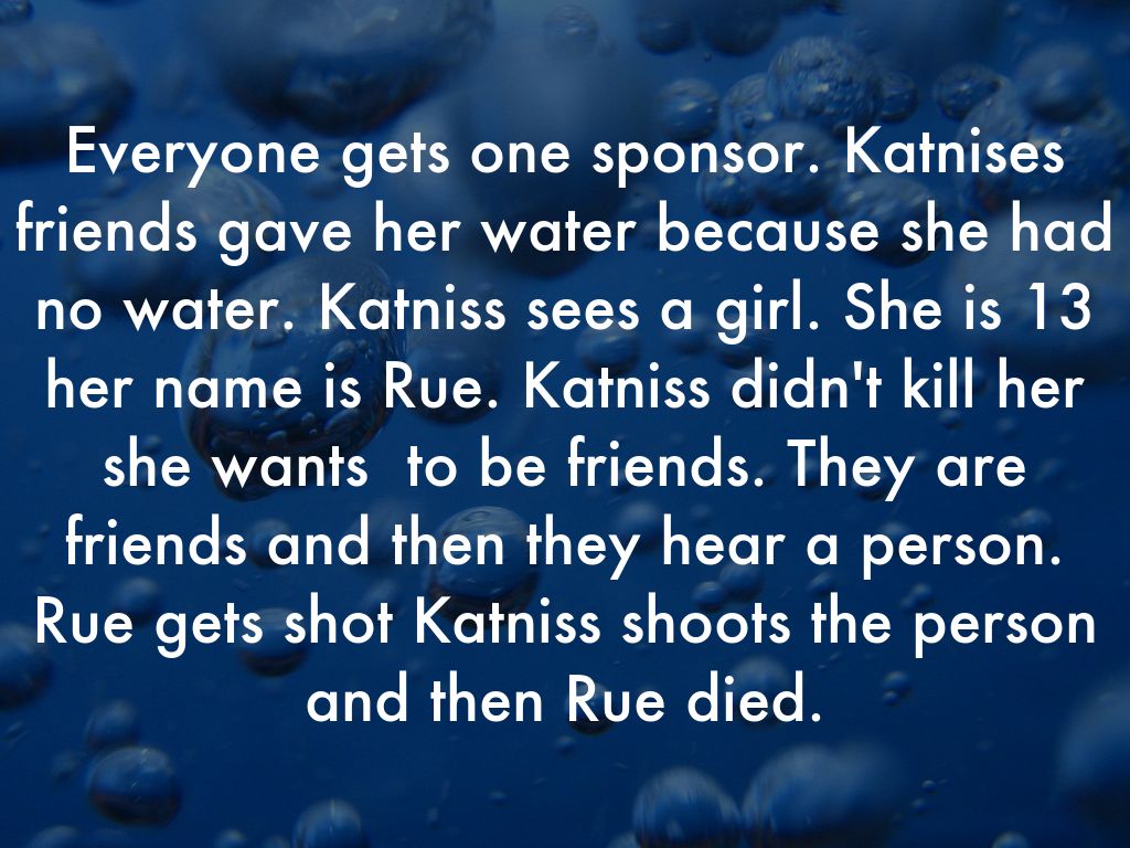 Everyone gets one sponsor. Katnises friends gave her water because she had no water. Katniss sees a girl. She is 13 her name is Rue. Katniss didn't kill her she wants to be friends. They are friends and then they hear a person. Rue gets shot Katniss shoots the person and then Rue died.