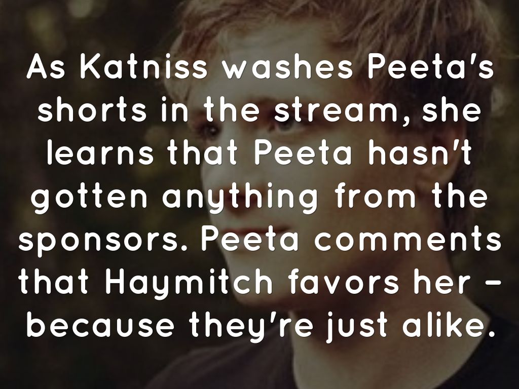 As Katniss washes Peeta's shorts in the stream, she learns that Peeta hasn't gotten anything from the sponsors. Peeta comments that Haymitch favors her – because they're just alike.