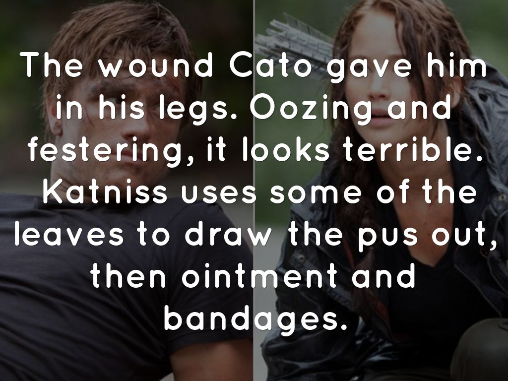The wound Cato gave him in his legs. Oozing and festering, it looks terrible. Katniss uses some of the leaves to draw the pus out, then ointment and bandages.