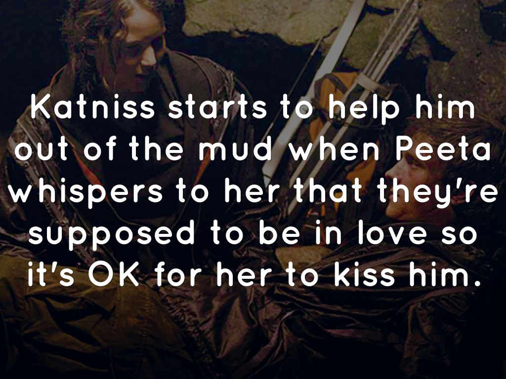 Katniss starts to help him out of the mud when Peeta whispers to her that they're supposed to be in love so it's OK for her to kiss him.